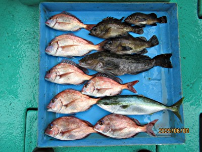 マダイ0.4〜0.5キロ5枚、ハナダイ2枚、Kメバル3匹、良型アイナメ1本、イナダ1本でした。