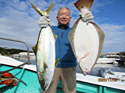 [JPEG画像]: T様、ヒラマサ3.7キロ、ヒラメ2.5キロでの写真となりました。
