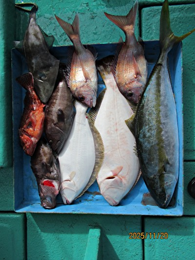 マダイ0.6、0.7キロ2枚、大型カサゴ1匹、良型マハタ2匹、ウマズラ1匹、ヒラメ2.5、1.5キロの2枚、ヒラマサ3.7キロ1本でした。