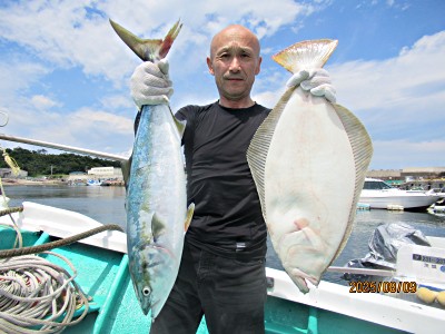 [JPEG画像]: 栃木県からのH様、本日貴重な青物ワラサ3.4キロとヒラメ2.6キロでした。