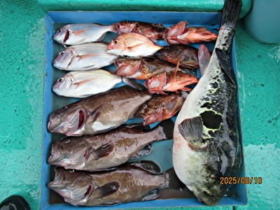 ワラサ3.4キロ1本、ヒラメ2.6キロ1枚、大サバ2本、刺身級マハタ3匹、マダイ1.4キロ1枚、1.2キロ2枚、ホウボウ1本、カサゴ1匹、フグでした。