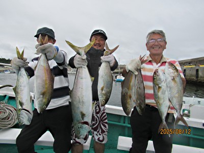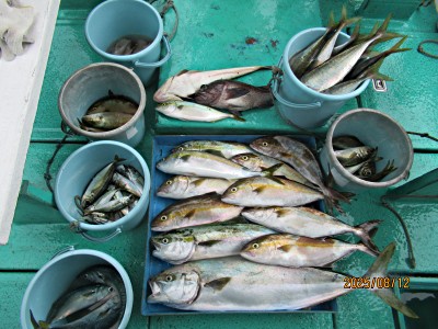 アジ特大15匹、大中小82匹合わせて97匹、ヒラマサ5.0キロ1本、ワラサ3.2キロ1本、カンパチ1.6キロ初め9本、イナダ3本、ショゴ18匹、サバ24本、刺身級マゾイ1匹、マゴチ1匹、カサゴ1匹、他フグでした。