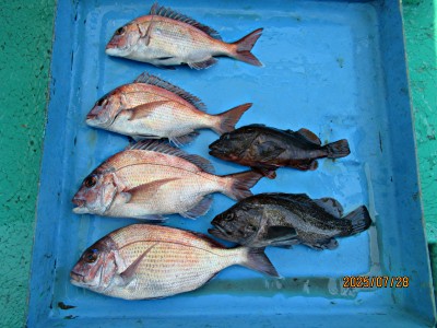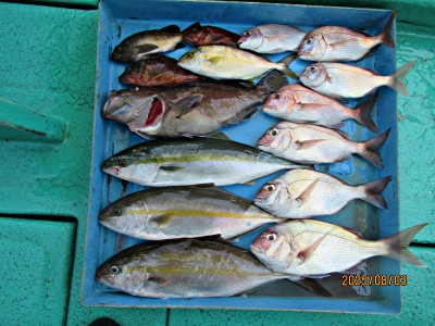 アジ大中小混じり78匹、マダイ0.4〜0.7キロ4枚、ハナダイ3枚、刺身級カンパチ2本、イナダ1本、刺身級マハタ1匹、ショゴ1匹、カサゴ2匹、Kメバル1匹でした。