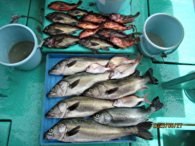 シーバス3.2〜4.5キロ4本、2本/人合わせて6本、良型Kメバル5匹、マダイ0.3、0.5の2枚、ハナダイ2枚、カサゴ8匹でした。