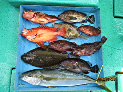 アジ大中小混じり6匹、マダイ0.4〜0.8キロ7枚、ハナダイ6枚、カサゴ8匹、ホウボウ3本、Kメバル3匹、ムシガレイ1枚でした。