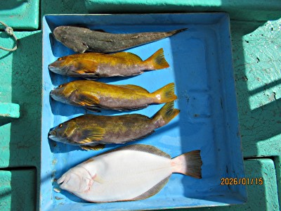 ヒラメ今日も食い渋かったです。本日の釣果ヒラメ1.0キロ1枚、良型アイナメ3本、良型マゴチ1本でした。 朝から晴れ北西〜西の風3〜5m程度ほぼ凪でした。今日も浅場メインで探りましたが朝はイワシの反応は結構有りましたが時間経過と共に薄くなりヒラメも付いて居ないのか当たりも遠くヒラメ1枚、マゴチ1本と苦戦でした。 途中から浅場、根の周りを探り良型アイナメ3本をゲットに終わりました。ひたちなか市からのK様、何とか大判をと頑張って頂きましたが叶いませんでした。 朝は寒かったですがお疲れさまでした。有難うございました。