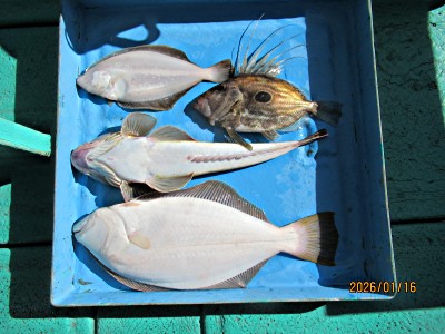 青物不調、マダイは形無し。本日の釣果ワラサ2本、大サバ4本、ヒラメ1.2キロ1枚、マハタ1匹、ホウボウ1本、ウマズラ1匹でした。 今朝は雨あがりで冷え込みは弱かったです。西〜南西の風3〜後半6〜10m超え11時過ぎ沖上がりでした。 水深35〜55m付近表層水温14.6〜16.5度でした。今日の青物ポイントはベイトの反応もイマイチチョロで青物付いて居ませんでしたがワラサ何とか2本、大サバ4本、ヒラメ、マハタをゲットする事が出来ました。 後半マダイ狙いに変更でしたが当たりも無くホウボウ1本他に終わりました。10時半過ぎから南西の風やや強くなり11時頃は10m超えとなった為沖上がりを決断帰港となりました。 お疲れさまでした。有難うございました。