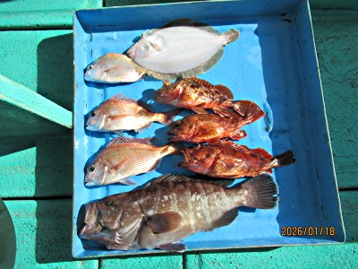 マダイも不調でした。本日の釣果マダイ0.3、0.5の2枚、ハナダイ1枚、マハタ1.8キロの良型1匹、カサゴ3匹、ガンゾウビラメ1枚でした。 朝から晴れ北西〜北の風4〜5m程度風波、北からのウネリでゴロンゴロンの揺れ当たりも取りづらい海況でした。水深35m付近表層水温14.0〜14.3度でした。 今日は朝から終始ウネリ、当たりも取りづらくベラに邪魔されながらも頑張って頂きましたが本命マダイは2枚に終わりました。 福島県郡山市からのT様のご期待に添えませんでした。お疲れさまでした。有難うございました。