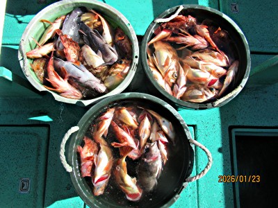 メバルまだ一山にならず苦戦でした。本日の釣果Rメバル抱卵も含め8〜15匹/人合わせて33匹、Kメバル2匹、大中カサゴ12匹、良型マゾイ2匹、良型マハタ1匹でした。 今季一番の冷え込み、指先が痛くなりました。朝から晴れ北西からの風弱く凪の釣り日和でした。 水深35〜45m付近表層水温13.6〜14.2度でした。今季初メバルでしたが底の水温がまだ高いのかメバル一山にまとまっていないのか実績のポイントを広範囲に探りましたが各ポイントでの散発拾い釣りでした。 皆さんに頑張って頂きお土産は少々ゲット出来ました。日中は風も無く日差しも強くなり比較的暖かくなりました。 お疲れさまでした。有難うございました。