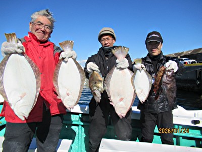 ヒラメ食い渋く不調でした。本日の釣果ヒラメ0.7〜2.8キロ1〜2枚/人合わせて4枚、マトウダイ1枚、良型カサゴ2匹、Kソイ1匹でした。 今朝も厳しい冷え込みで指先が痛くなりました。朝から晴れ北西〜西の風4〜6m後半8m程度風波高で当たりも取りづらい海況でした。 イワシの反応は一部では有りましたがほんのチョロ程度でした。やや強風で寒い中また波高の中頑張って頂きましたが当たりもイマイチで苦戦、それでも粘って頂きヒラメ1〜2枚、外道も少々ゲットして頂きました。 指先も痛くなる厳しい中頑張って頂きました。お疲れさまでした。有難うございました。