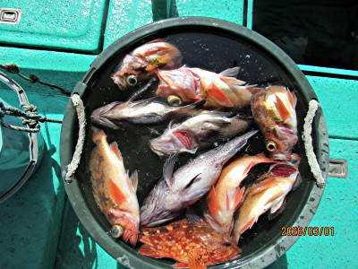 今日も絶不調でした。本日の釣果抱卵含むRメバル3〜8匹/人合わせて11匹、Kメバル2匹、メダイ最大2.0キロ1〜3匹/人合わせて4匹、カサゴ3匹でした。 朝から曇り北からの風4〜6m程度、やや風波高でした。水深30〜50〜70m付近表層水温13.8〜14.1〜14.3度でした。 今日は浅場の根の周りから深場まで広範囲に探りましたがメバル、根魚も反応無し居ませんでした。 今日も釣りの時間よりも反応探しの時間の方が長くなりました。お二人様に粘って頂きましたが今日もお土産少々でした。 お疲れさまでした。有難うございました。